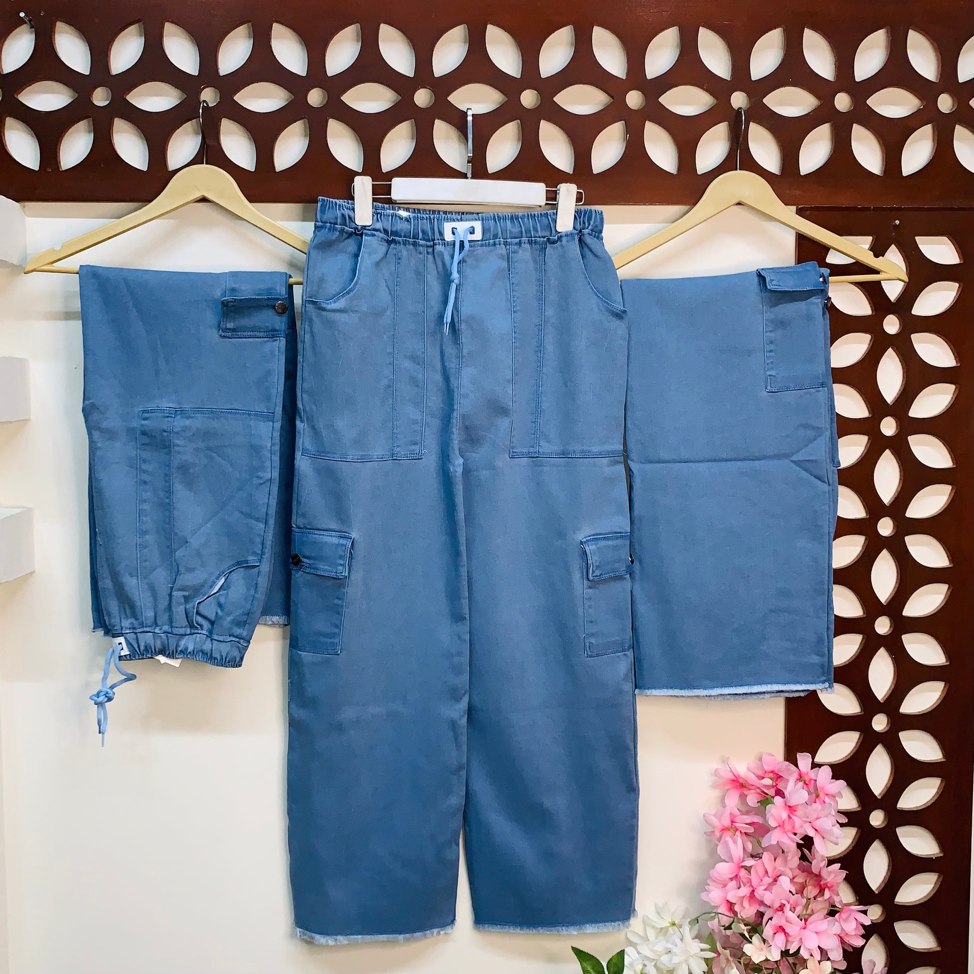 Designed for comfort and functionality, these jeans an elastic waistband with a drawstring for a perfect fit, two spacious side pockets, and two flap cargo pockets for added utility.